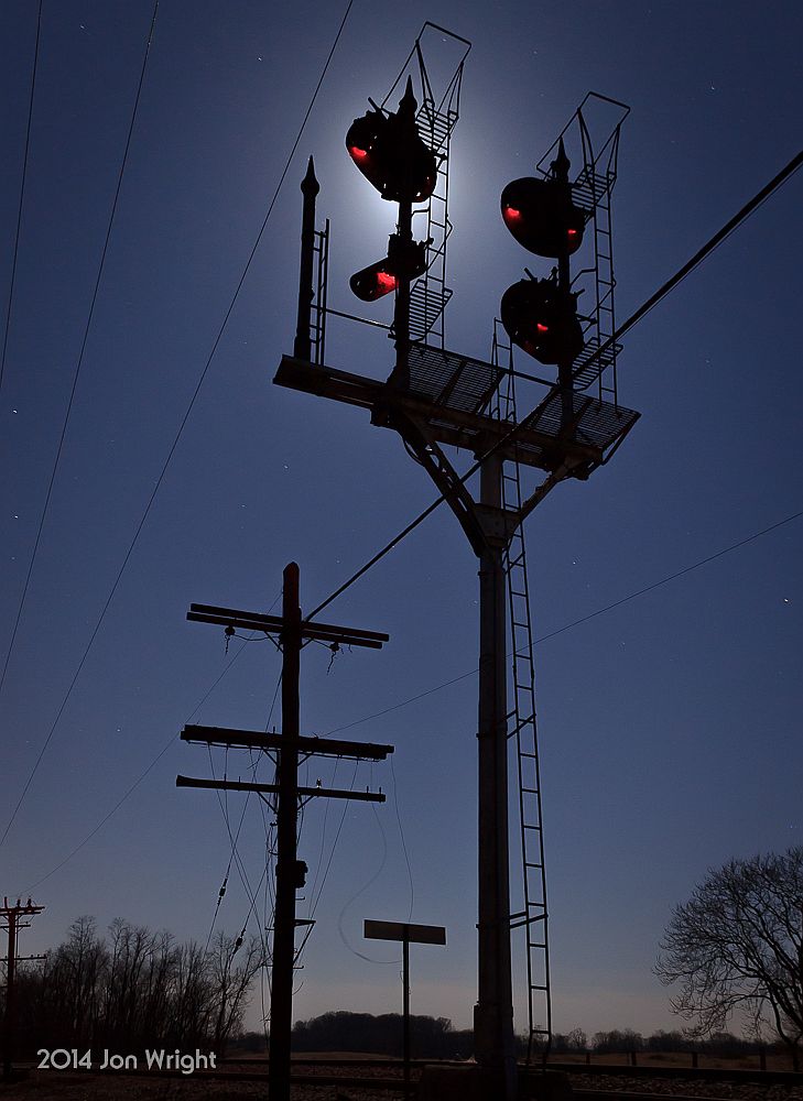 H22.7 The N&W Shenandoah Junction CPL Signal Bracket Mast and code line pole is silhouetted against overnight sky lit up by the Full Moon of March 2014.