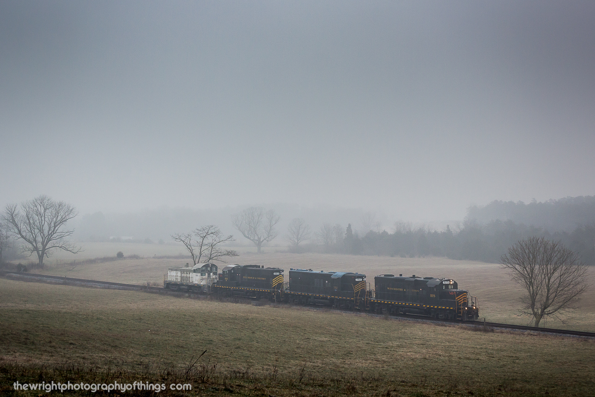 Winchester and Western’s “Sandman” out of Gore, VA has seen better days. With fuel prices at a steady low, Unimin, it’s parent company and biggest customer has been trucking many loads out of the mine leaving the railroad with odd and end jobs. Today it leaves with WW 1200 in tow after being serviced and being returned to the Essroc plant in Martinsburg, WV where it now see’s its regular service. The train is rolling down Gainesboro Hill just south of it’s namesake town.
