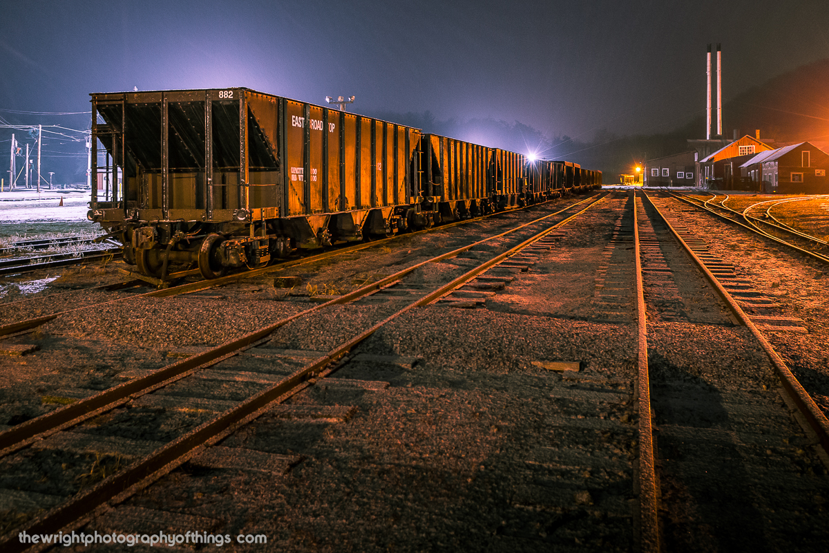 Published January 25, 2016 at 1200 × 800 in The yard of the East Broad Top Railroad lies dormant, like it has for much of the past 5 years. The narrow gauge railroad ceased operations in the 1950’s and in 2011 saw the last public tourist excursion. Not much has changed since. The steam locomotives sit in shelter awaiting their next duty. These hoppers sit in the yard on this night exposed to the cold and blowing snow.