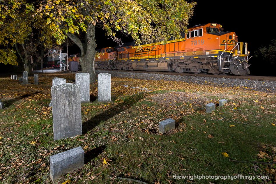 A trio of BNSF motors lead intemodal train 201 passes a local cemetery in Pennsylvania’s Cumberland Valley near Shippensburg on the Norfolk Southern Lurgan Branch in Walnut Bottom.