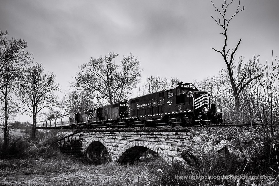 A southbound Winchester and Western train special from Hagerstown to Winchester crosses Mill Creek in Bunker Hill, WV on an original Cumberland Valley Railroad stone arch bridge that dates to the railroads construction in 1889.