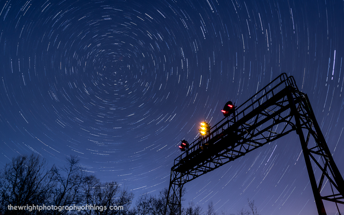 Twenty-Seven and a half minutes elapse in this collection of four shots layered together as the Pennsy signal bridge at AR (Allegheny Range) stands tall against the backdrop of the swirling night sky and the North Star. This signal stands close to the Pennsylvania Railroad’s summit across the Eastern Continental Divide 2,167 feet above sea level and lets eastbound crews know half the journey over the mountains is complete before they enter Portage Tunnel and into “The Slide” and down the mountain.