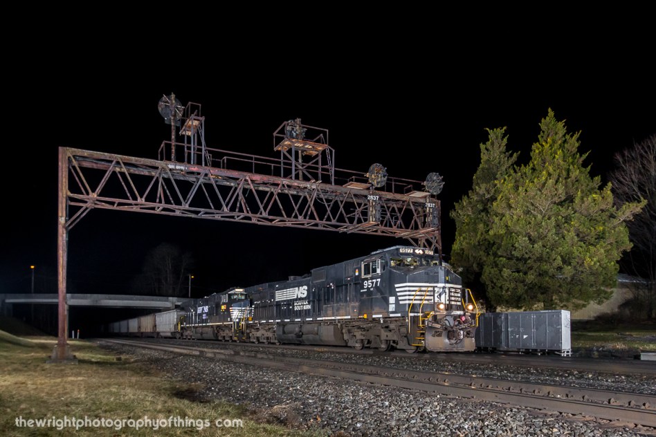 A loaded coal train destined for the port of Baltimore passes under this classic Pennsylvania Railroad signal bridge at Summerhill, PA just after midnight on February 20, 2017.