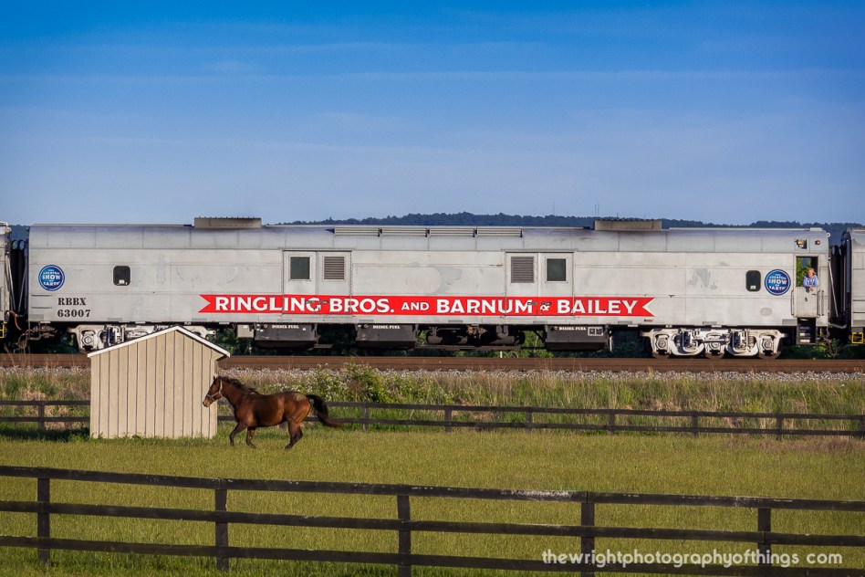 A horse races the cars on the last Ringling Brothers and Barnum and Bailey Circus train as an onlooker from the train takes in the scenery as the “Greatest Show on Earth” heads to it’s final stop in 147 years.
