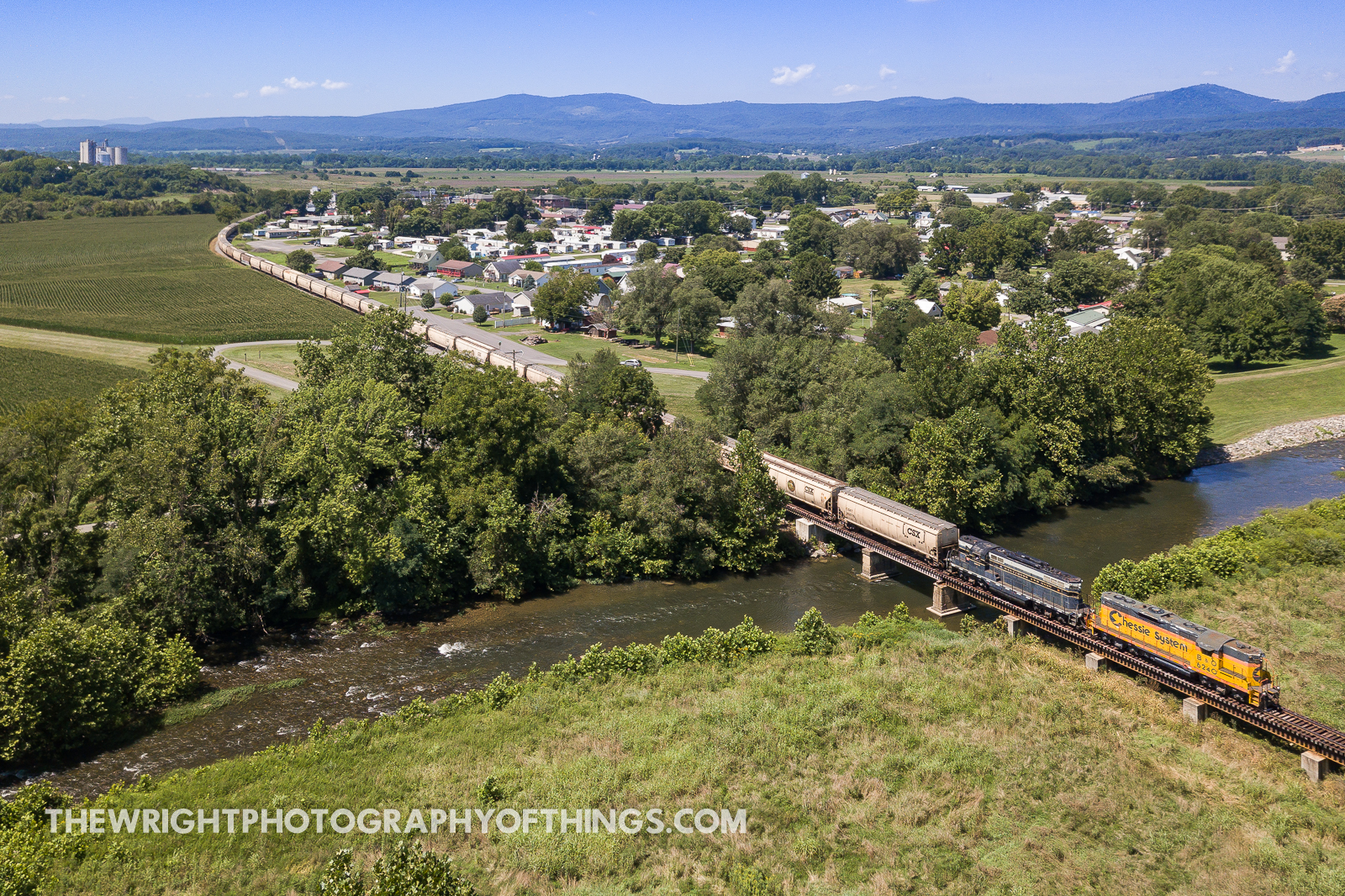 Crossing over the South Fork South Branch of the Potomac River. Two venerable locomotives push 32 loaded grain cars towards the Pilgrim’s Pride mill seen in the distance on Monday, August 10th. 12 additional cars will be set off for Petersburg, WV. B&O 6240 built as C&O 6240 in the standard C&O paint in 1957 was transferred to the B&O and into Chessie colors and remains so to this day. B&O 6604 built in 1955 for passenger operations and numbered 751 was then painted into Chessie colors until its arrival in the early 1990s when it was painted back to it’s original B&O livery.