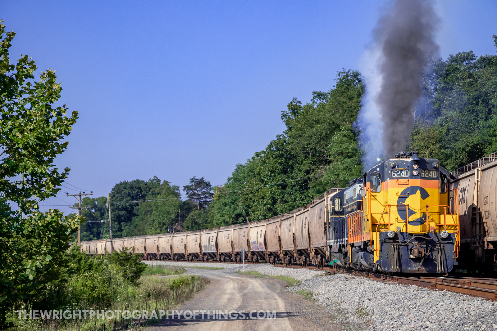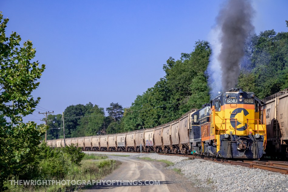 The train begins its upgrade assault out of Green Spring, WV. The days helper engines include SBVR 6240 and 6604 wearing the South Branch Valley’s predecessor paint schemes.