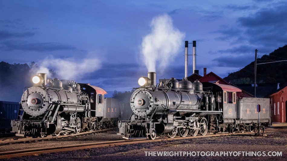 East Broad Top 2-8-2 Mikado steam locomotives 12 and 17 sit out front of the EBT shops in Rockhill Furnace, PA at dusk to let off a little simulated steam on Saturday, October 24, 2020.