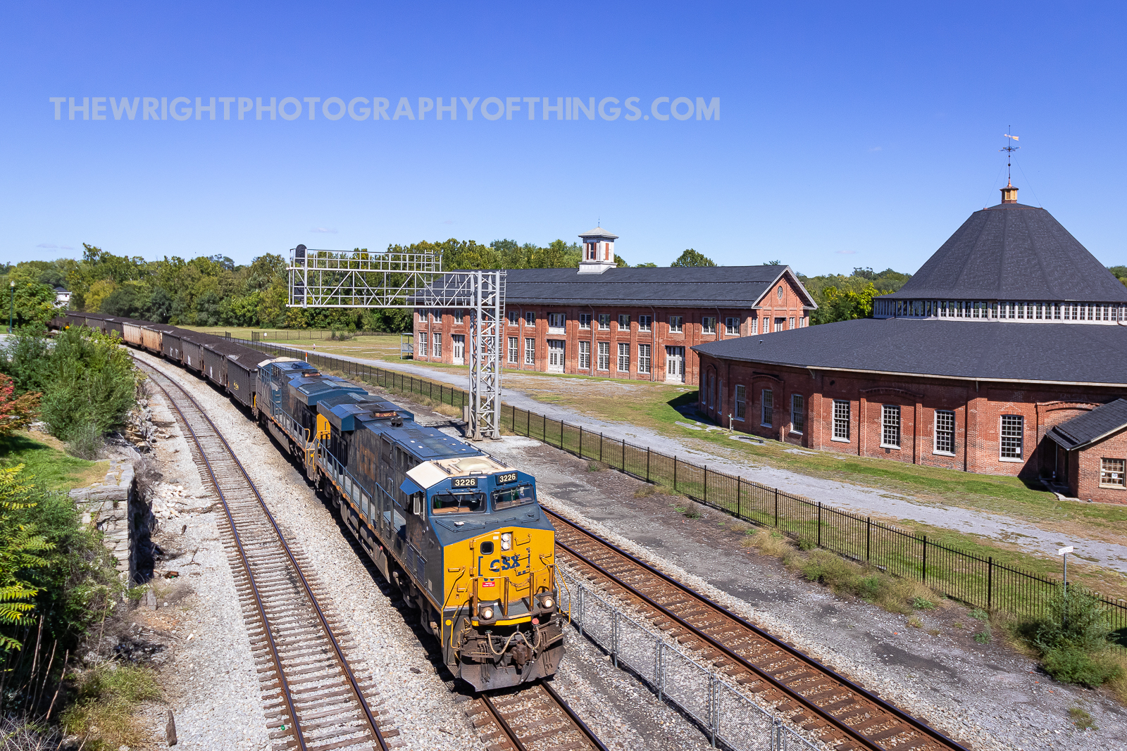CSX train Q372 a Cumberland to Philly manifest train passes by the Baltimore and Ohio Railroad Roundhouse in Martinsburg, WV in the afternoon on Friday March 11, 2022.