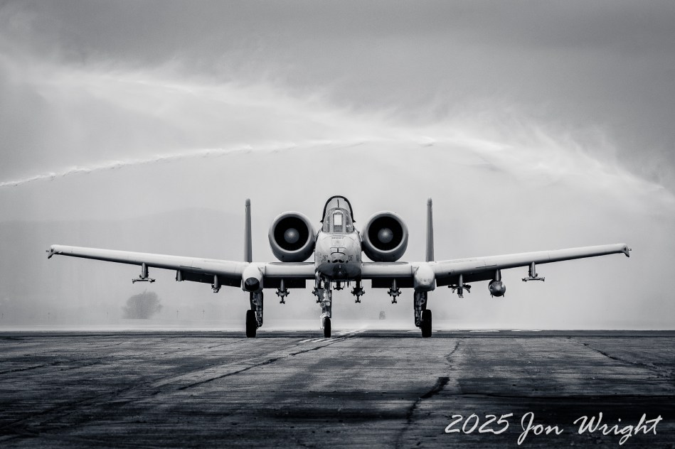 Getting a water cannon salute after its final flight on September 22, 2025 is this Republic-Fairchild A-10C Thunderbolt II “Warthog” numbered 79-0087, which made its first taxi on this same tarmac 46 years ago. This aircraft, piloted by Major Taylor “SNARF” Price and manufactured by the Fairchild faithful here in Hagerstown back in 1979 will now permanently call its home the Hagerstown Aviation Museum which ironically is in the same hangers and offices the jet was assembled in.The 104th Fighter Squadron “Fightin’ O’s” of the 175th Air Wing in the Maryland National Guard have been the proud custodian of the A-10 since 1979 and has seen combat in Iraq and Afghanistan. The squadron had divested the remaining A-10s to other units or retirement thus leaving 087 the last. The 104th and support ops was decommissioned the foillowing day.