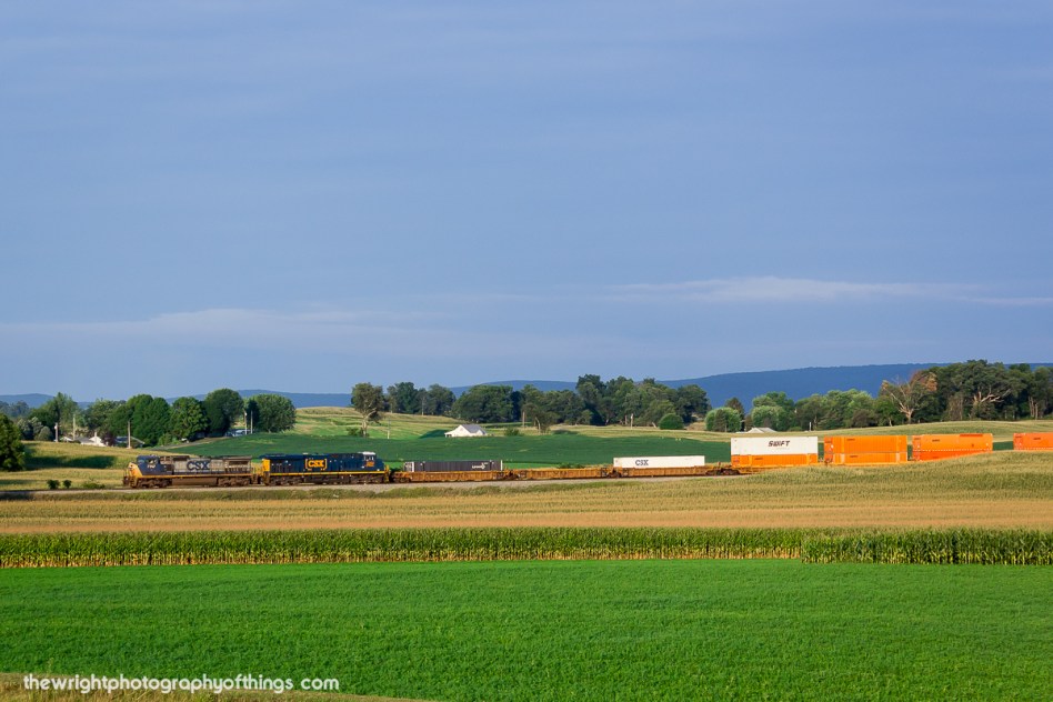 » Approaching the terminal in Chambersburg, PA, CSX train Q016 passes through fertile farmland on its voyage on the former Western maryland Railway line.