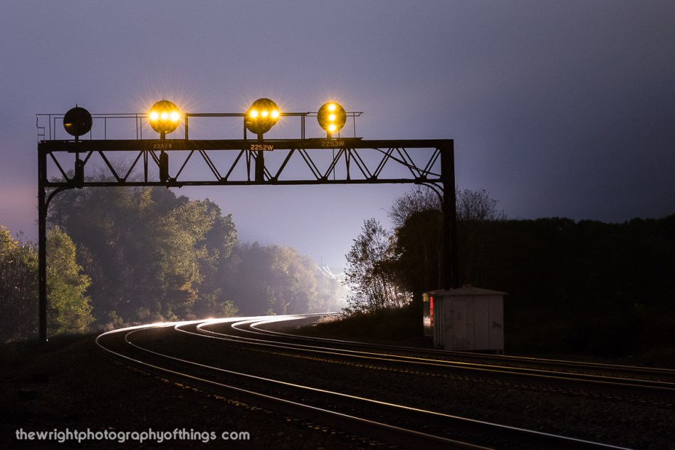 With a coal train stopped at CP GRAY. an eastbound intermodal approaches the PRR signals at Tipton, PA. Why was the coal train important? Because it was still in the block and kept the westbound signals lit.