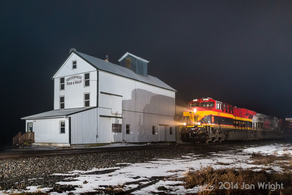 NOT IN KANSAS ANYMORE: Kansas City, MO that is… Cutting though the light drizzle and thick fog in South Central PA on the Norfolk Southern Lurgan Branch is “Belle” Kansas City Southern 4765 on NS intermodal 204 as it makes it’s way to Harrisburg and the Rutherford Terminal. Many thanks to Sean Hoyden for the use of his lighting equipment.