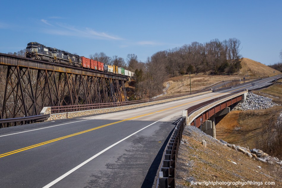 » US Route 340 parallels the H Line in many locales. Here 37Q passes high above the road at Compton near Rileyville.