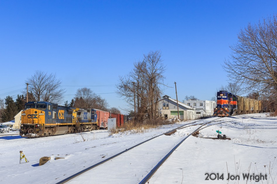 MARYLAND MIDLAND » Coming up the mountain long hood forward on the former Western Maryland East Sub, UBHF waits as CSX D795 on the Hanover Sub passes. UBHF will switch onto CSX trackage to drop off and pick up it’s train to take back to Union Bridge. 1/24/14