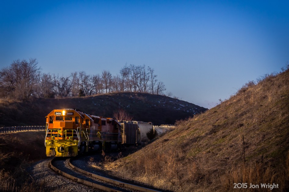 AROUND THE BEND: MMID 3450 3448 and 2601 push 20 empties hoppers to the Lehigh Portland Cement Plant alongside Shepherd’s Mill Road an hour after sunrise.
