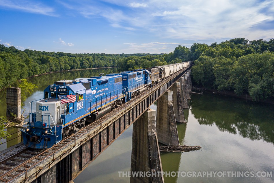 The conductor of 86 looks down on the Potomac River as the Winchester and Western train crosses high overhead. He told me earlier he always looks for turtles in the clear water below. He also explained the story behind the flag… Years ago while he was working for CSX he found the flag in the mud along a siding in Gaithersburg, MD. He picked it up and cleaned it. He has been putting it on his trains since as the days draw close to the Fourth of July.