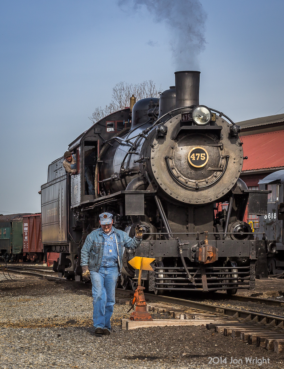 MANUAL SIGNALS: A crew member directs the engineer by use of hand signals to move forward after lining a switch to the lead into the shops for the evening.