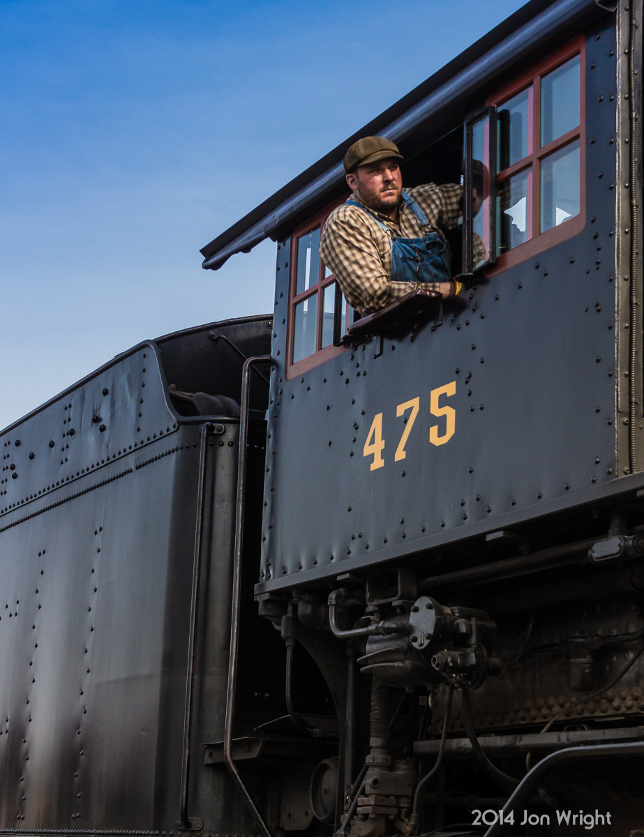 ALL CLEAR AHEAD: The Strasburg Railroad 475 engineer looks out ahead as the engine lurches forward toward the shop.