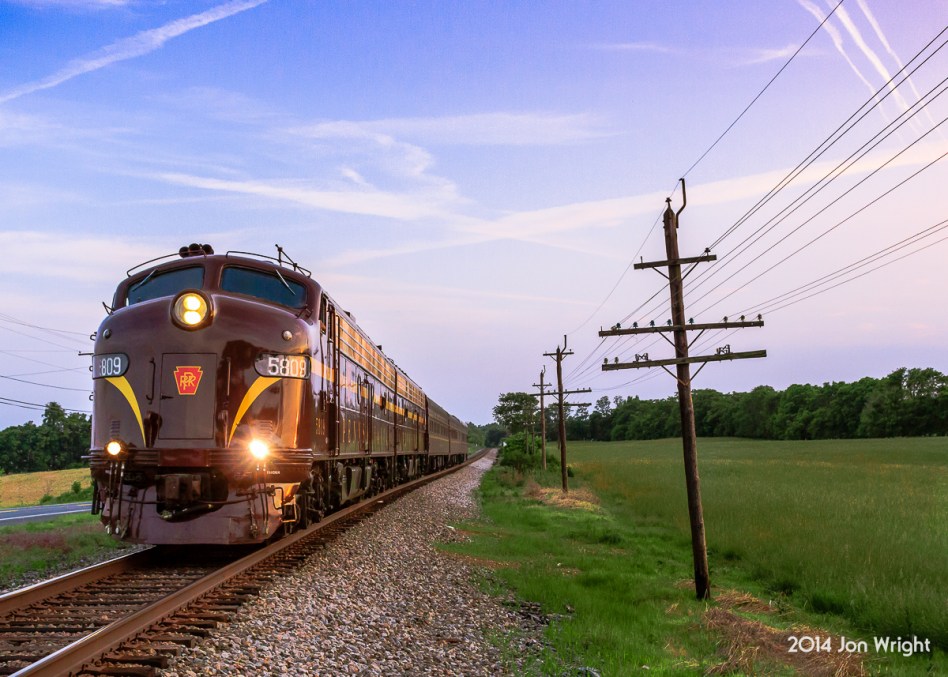 GOLDEN SLUMBERS: Returning from the Streamliner event in Spencer, NC are the Juniata Terminal restored PRR E8’s and train pictured at sunset after crossing the Potomac River. The train will stop at Hagerstown before continuing its trip back home to Philly the next day.
