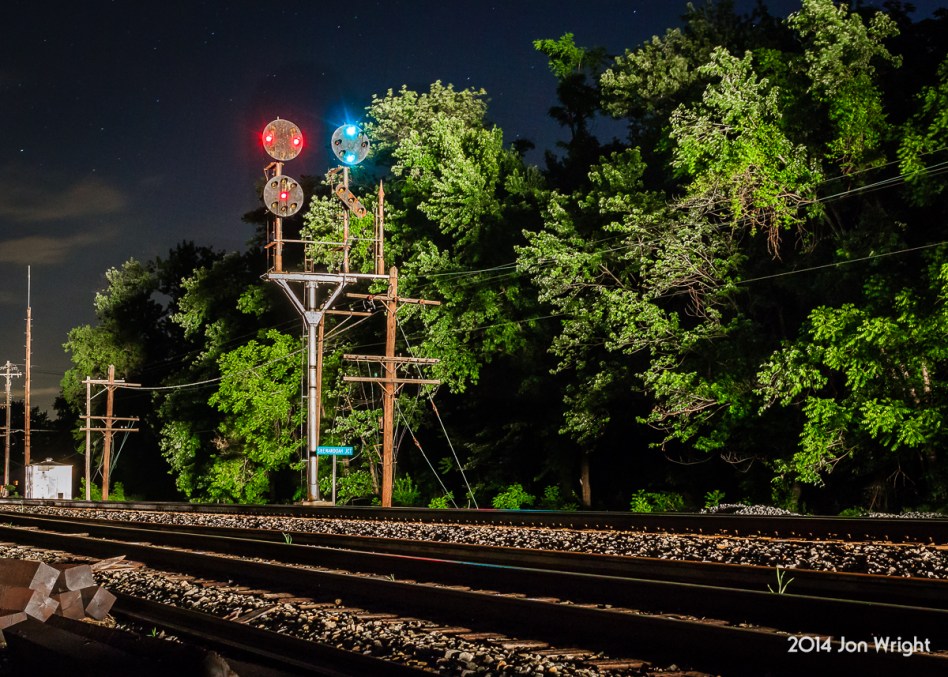H22.7 SHINE ON YOU CRAZY DIAMOND: These signals and their sister single mast for southbound movements are not long for this world as their replacements sit 8 miles south ready to be installed. The Norfolk and Western Color Position Light northbound bracket mast signals stand tall as oncoming NS train 36Q lights up the scene and has the clear indication to proceed north.