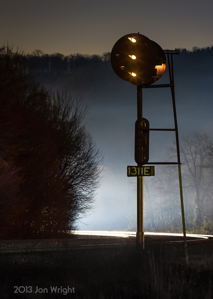 FOGGY CLEARANCE: A quiet night along Norfolk Southern’s Middle Division of the Pittsburgh Line is on break as an eastbound approaches the block from the west and lights up the PRR position Light signals and a westbound intermodal train prepares to round the curve illuminating the fog and tracks ahead silhouetting the mast signal.
