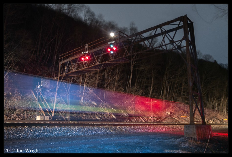 SOMETHING DIFFERENT: westbound empty hoppers lit up under the Dry Wall signals. Totally by accident as the red is from the tail lights of a truck and the blue from the led lantern I used.