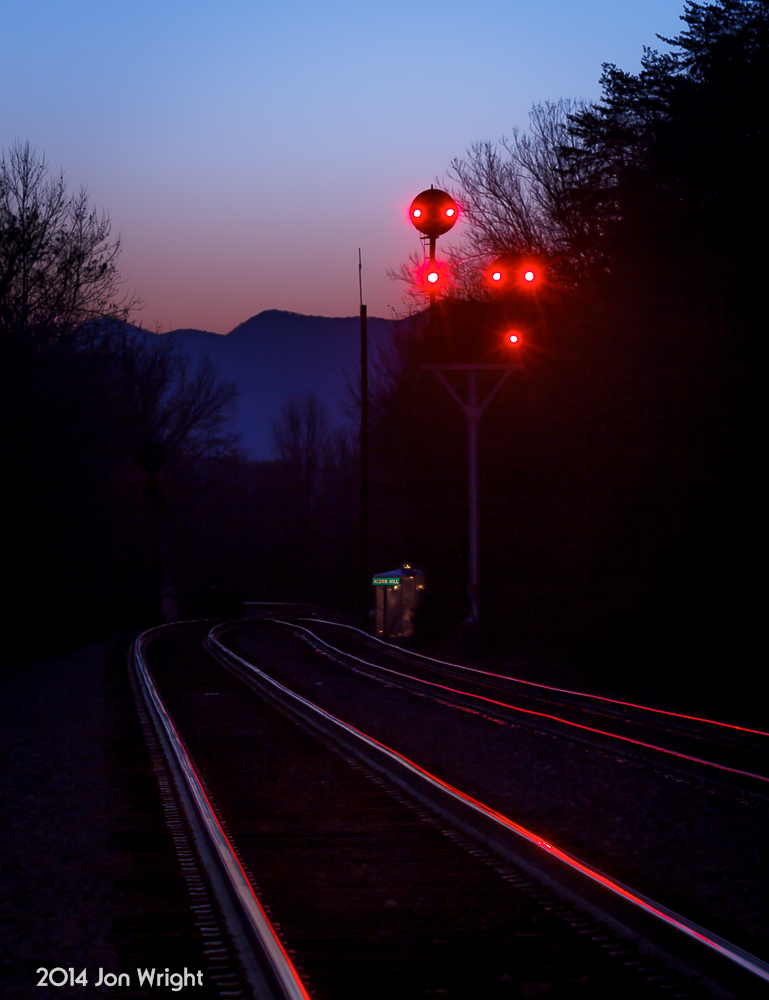 H73.4 ACORN HILL AT DUSK: The peaks of Massanutten Mountain loom behind the N&W color position light signals that guard the interlocking at the south end of the Bentonville siding in the Shenandoah Valley of Virginia.